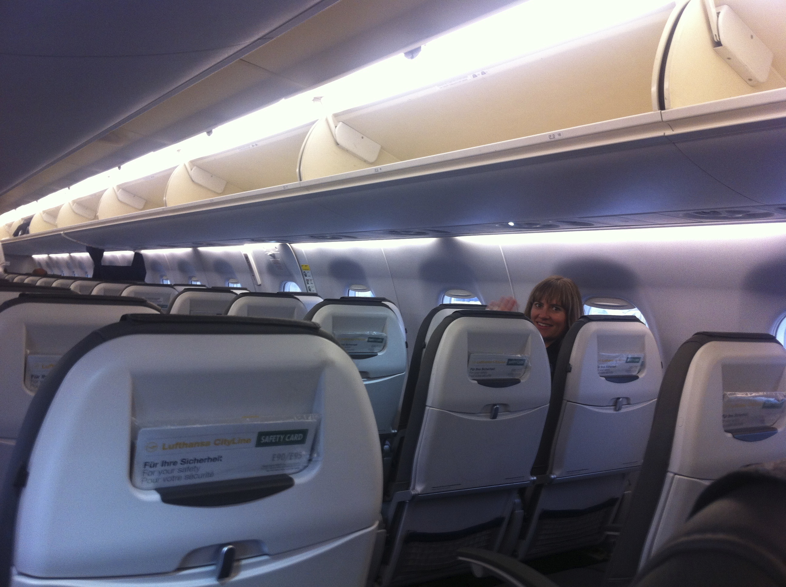 Gradually, the moon sunk down and the fog rose up with the sun. We parted fondly with our new friend Carl (born in Prague, now living in San Francisco, probably always sporting a battered chapeau and red suspenders), spirited away VIP style on a large bus that wound through the maze of Frankfurt tarmac like an air-conditioned Pac-Man. The bus driver – cheerfully transporting his two passengers – joked and laughed in German with a co-worker over the radio. After about four years of crisscrossing the airport, we waited in the bus for our Lufthansa puddle jumper’s doors to open. Up the ramp into the cabin, a male flight attendant with an immaculately coiffed shark fin of blond hair presented us with a welcome handful of hazelnut chocolate bars! We settled in, the first two on the plane by a long shot.