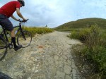Day four: Rain? Not a chance. High probability of water, however — in the form of a briny dip in the clear, gentle sea at San Vito lo Capo. Afterwards, a steady grind this morning; up was the word, all the way through the wide, sun bleached streets of Castelluzzo. In Castelluzzo, a large-ish brown dog joined the team. Sicily, as I’ve touched on before, is plagued by territorial canine mongrels that burst growling from gravel driveways at pairs of unobtrusive bike tourists. We experienced it already the day before around Chiesa Nuova and so this particular animal had us on edge.