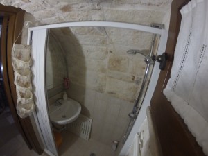 Alberobello, Italia: Just outside of the touristy Alberobello, we hole up in our very own renovated trullo. Space is precious, as illustrated by the juxtapostion of sink and shower.