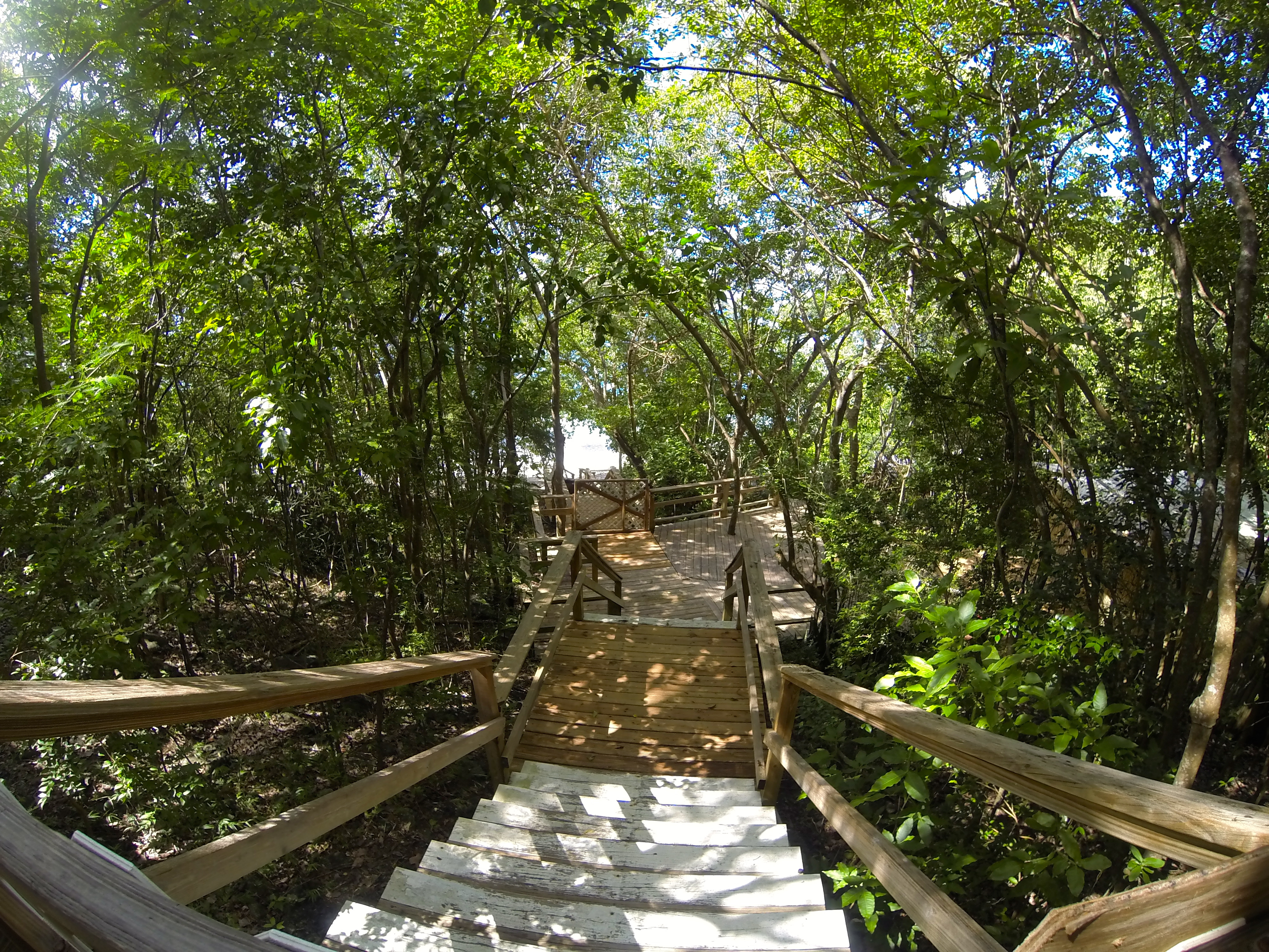 On a mosquito-riddled hike to Little Maho Bay, we stumbled upon a semi-recently abandoned campground/resort. At the bottom of the stairs, we found ourselves climbing over a gate posted “No trespassing.” Oops.
