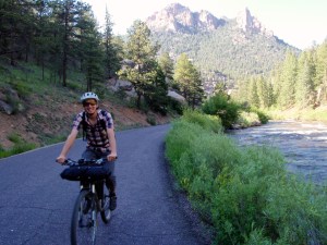 Riding along the swollen South Platte, with the Cathedral Spires (popular with climbers) in the distance.
