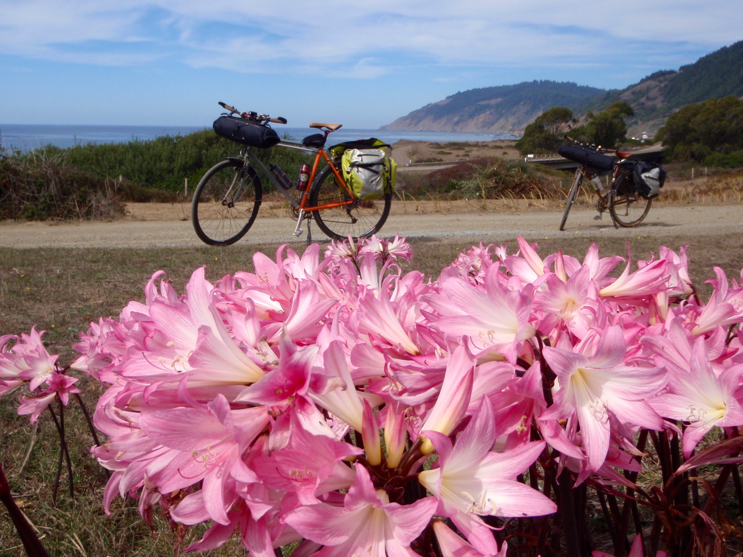 Another bike pic, this one with these pink flowers we’d seen all over the NorCal coast, but still aren’t sure what they are…