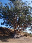 We found a trail (more or less a closed service road to the campground at the beach) that allowed bikes. Supplies in tow (cider), we headed out. This giant Eucalyptus tree stood just off the beach.