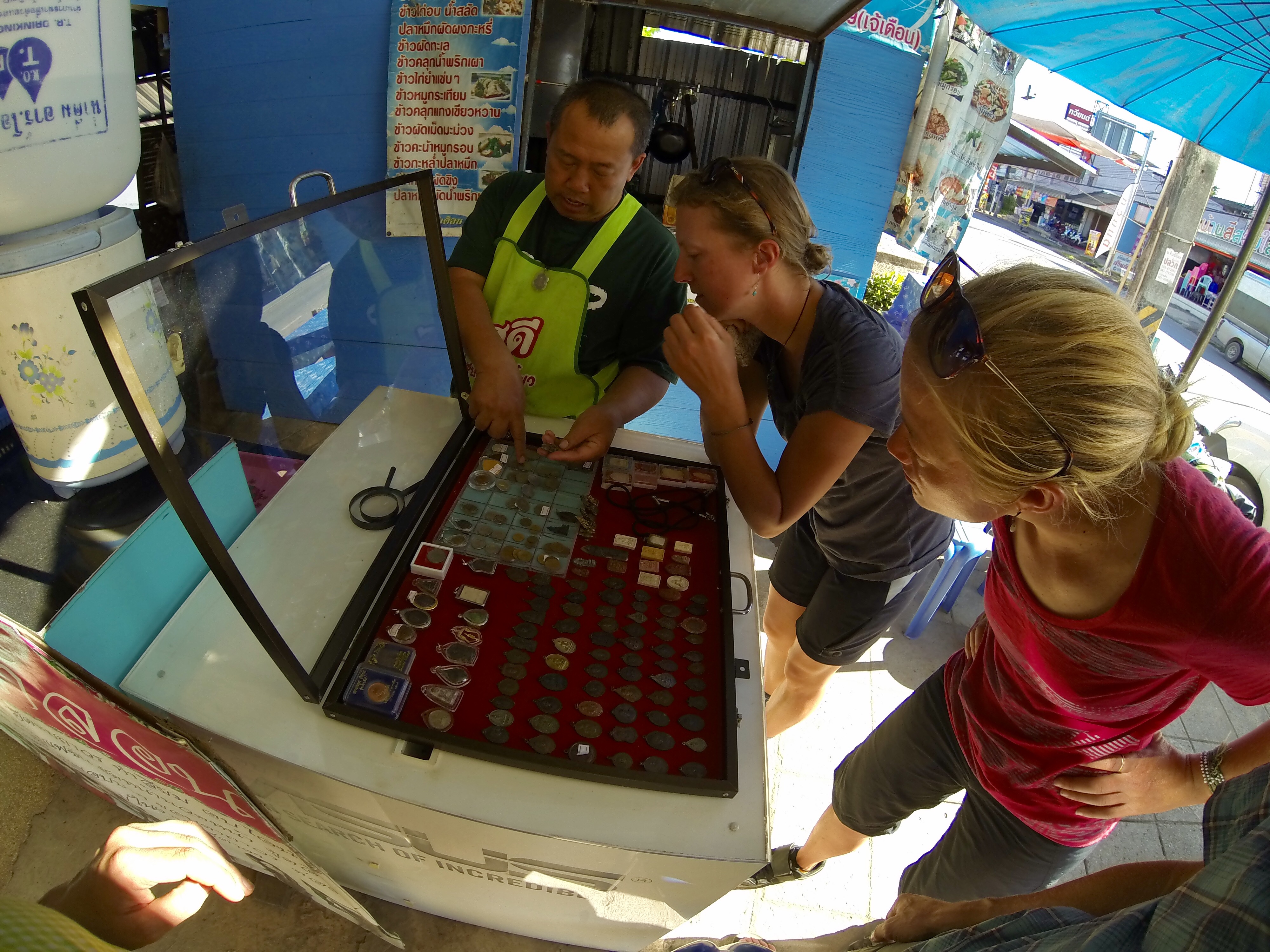 Kate buying a Buddha pendant from the nice fella at the lunch joint in Phaya Mang Rai.
