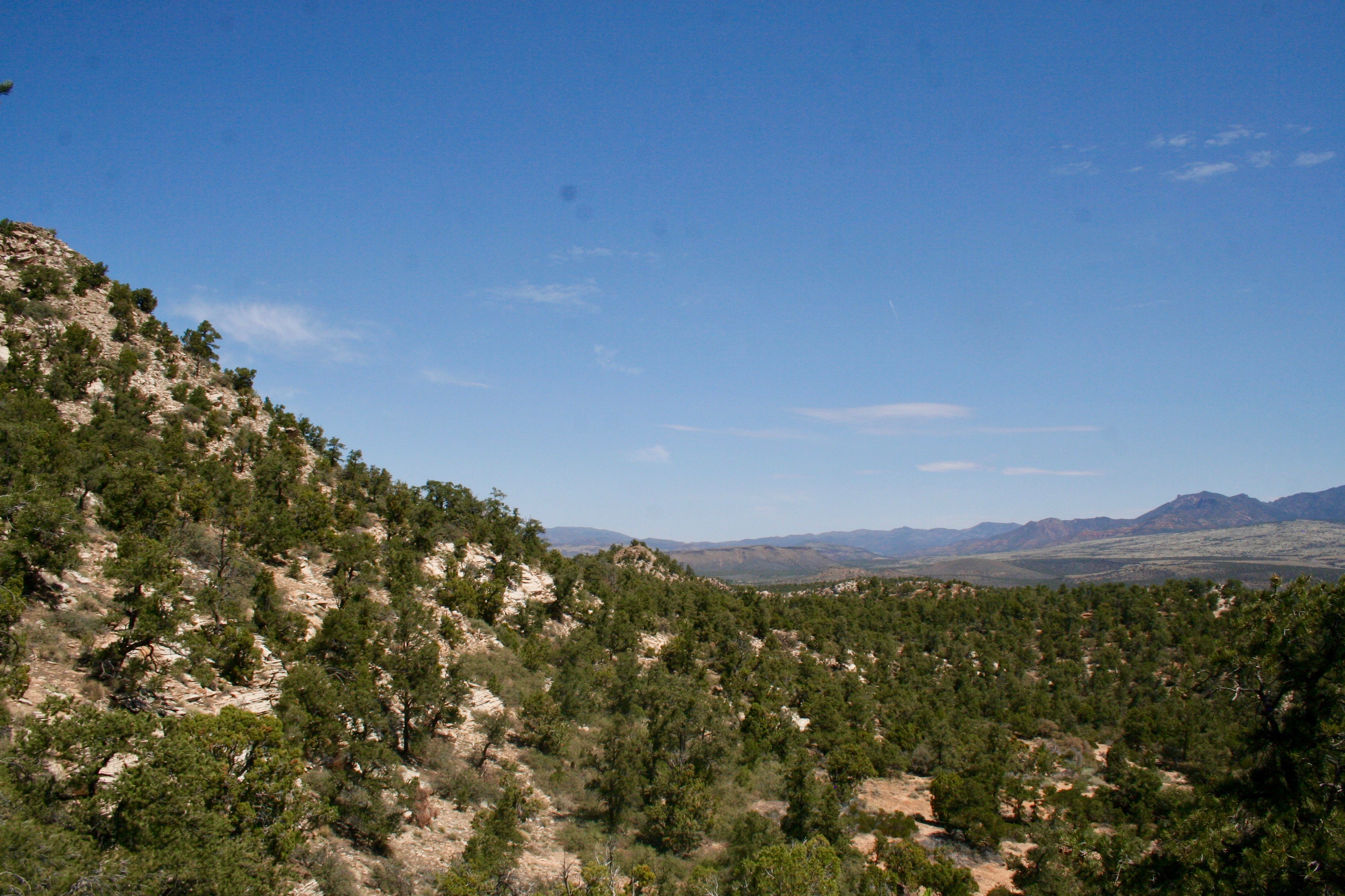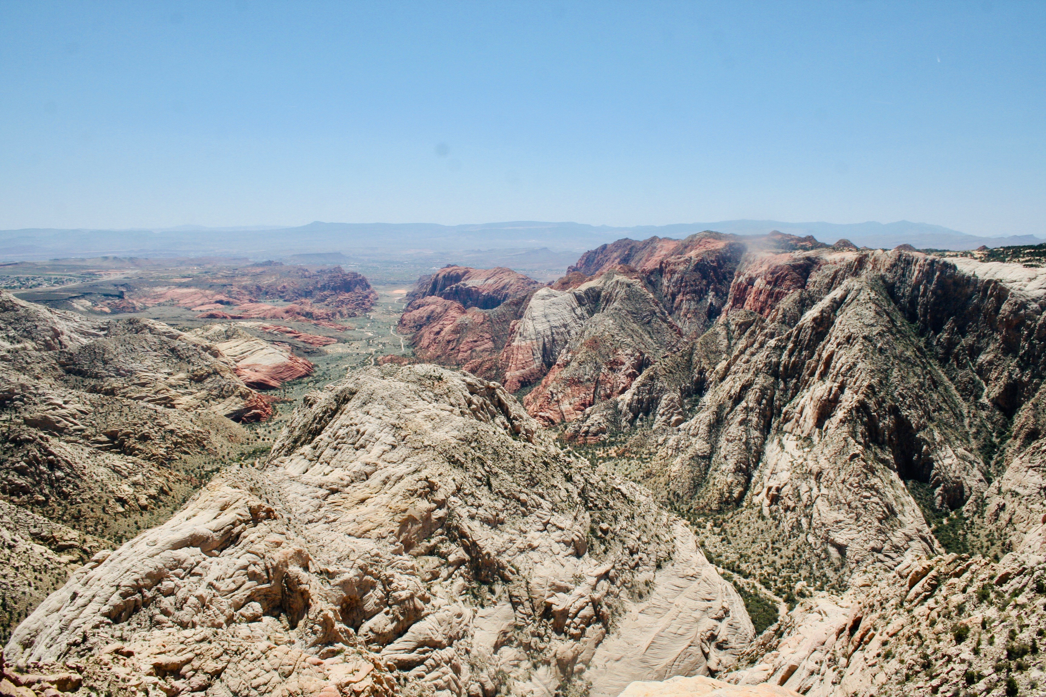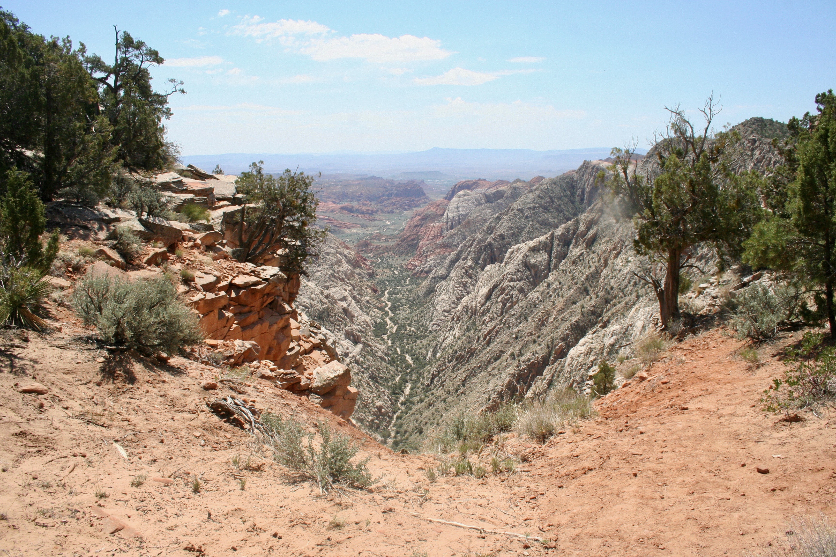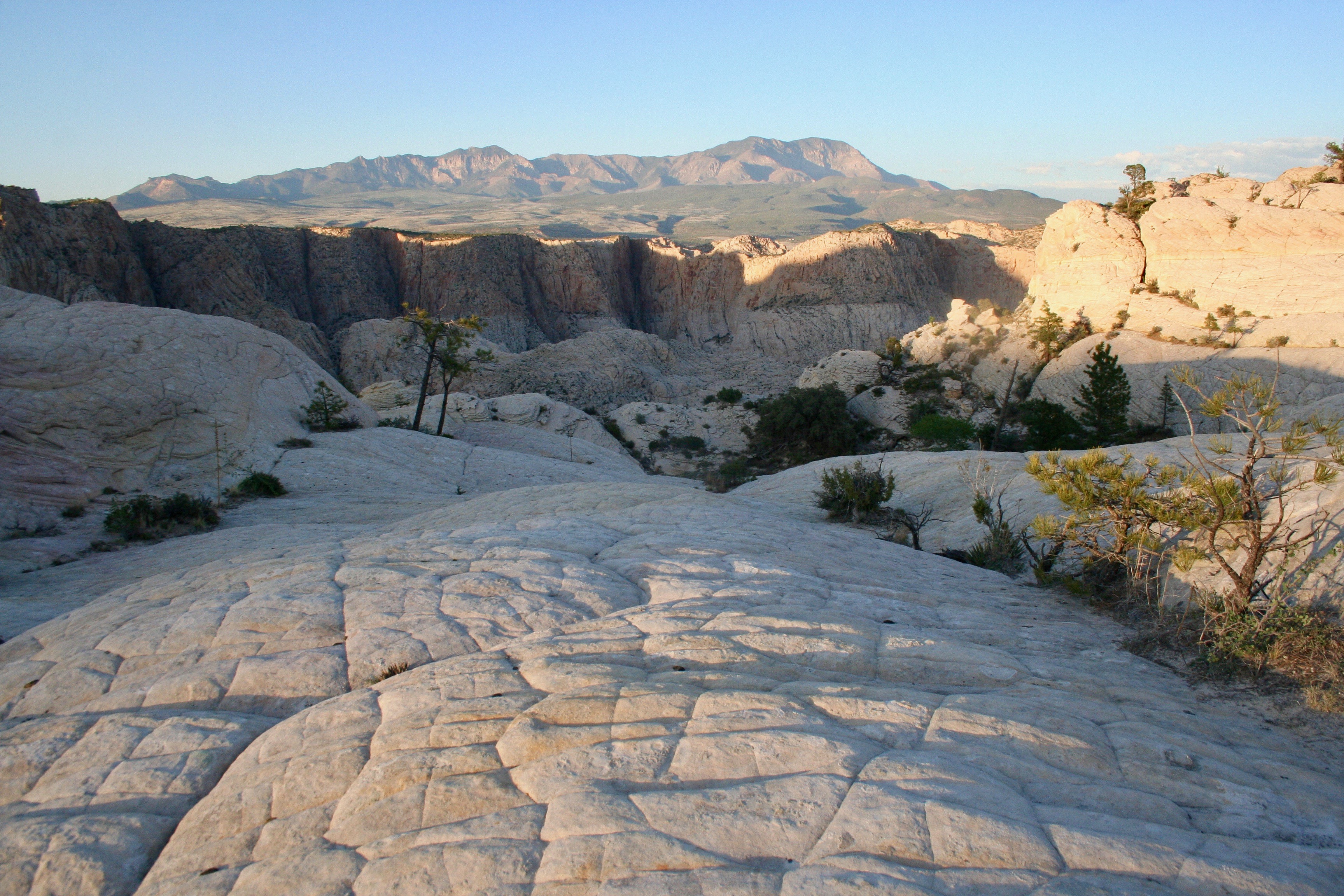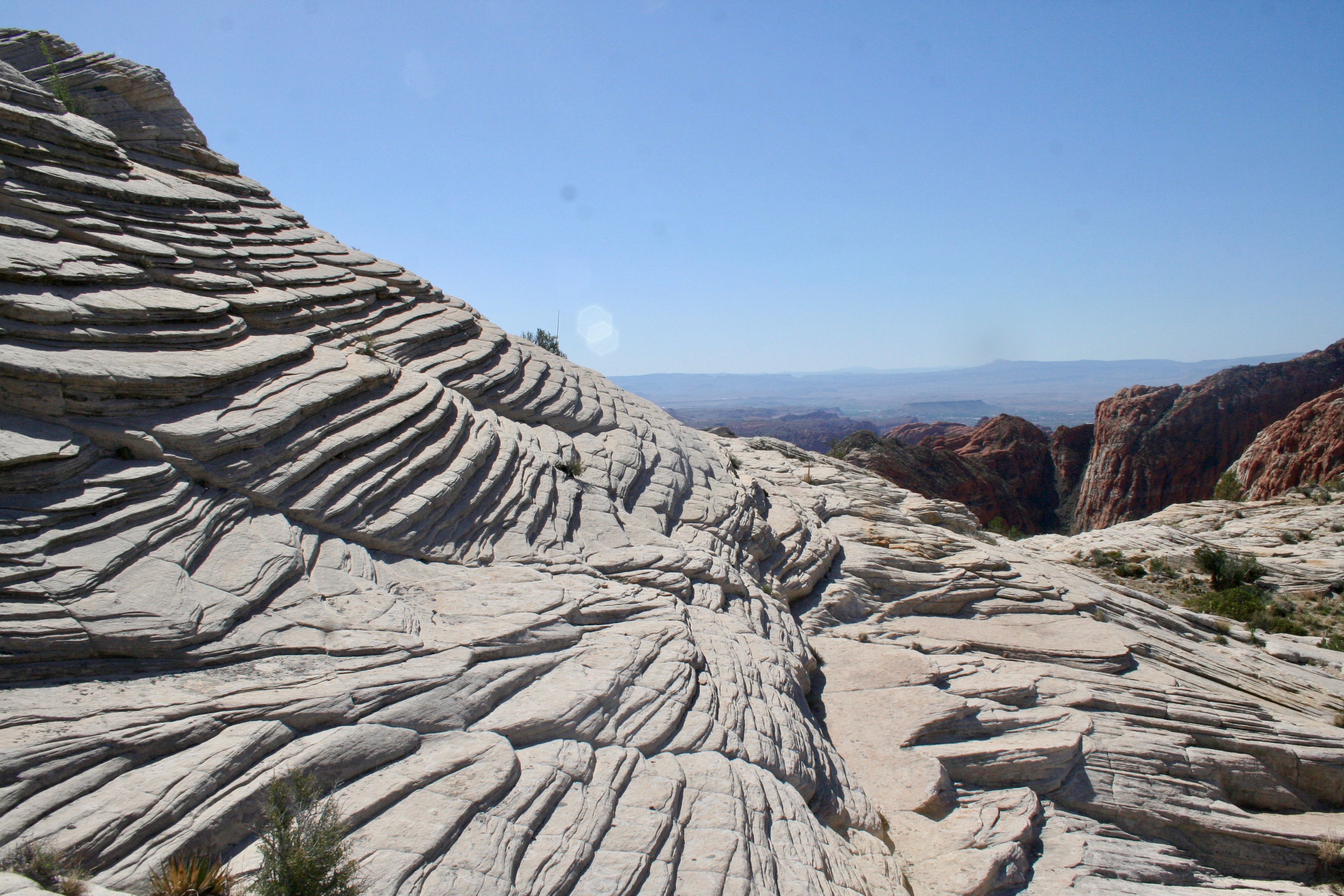 After another solid hour of hiking, I turned left off the main trail and followed the white sandstone bench south-ish. After a certain amount of turning left, it became a hard wave that dove off the side of a two-thousand foot cliff. I still had a decent stroll but it was relaxing as, with the cliff to my left, it was impossible to get too lost. Beyond the bench stretching ahead of me I saw the wide valley that houses St. George, Utah. Farther away still were the smoky shelves of the Arizona Strip in which was hidden the spectacular gash of the Grand Canyon.
