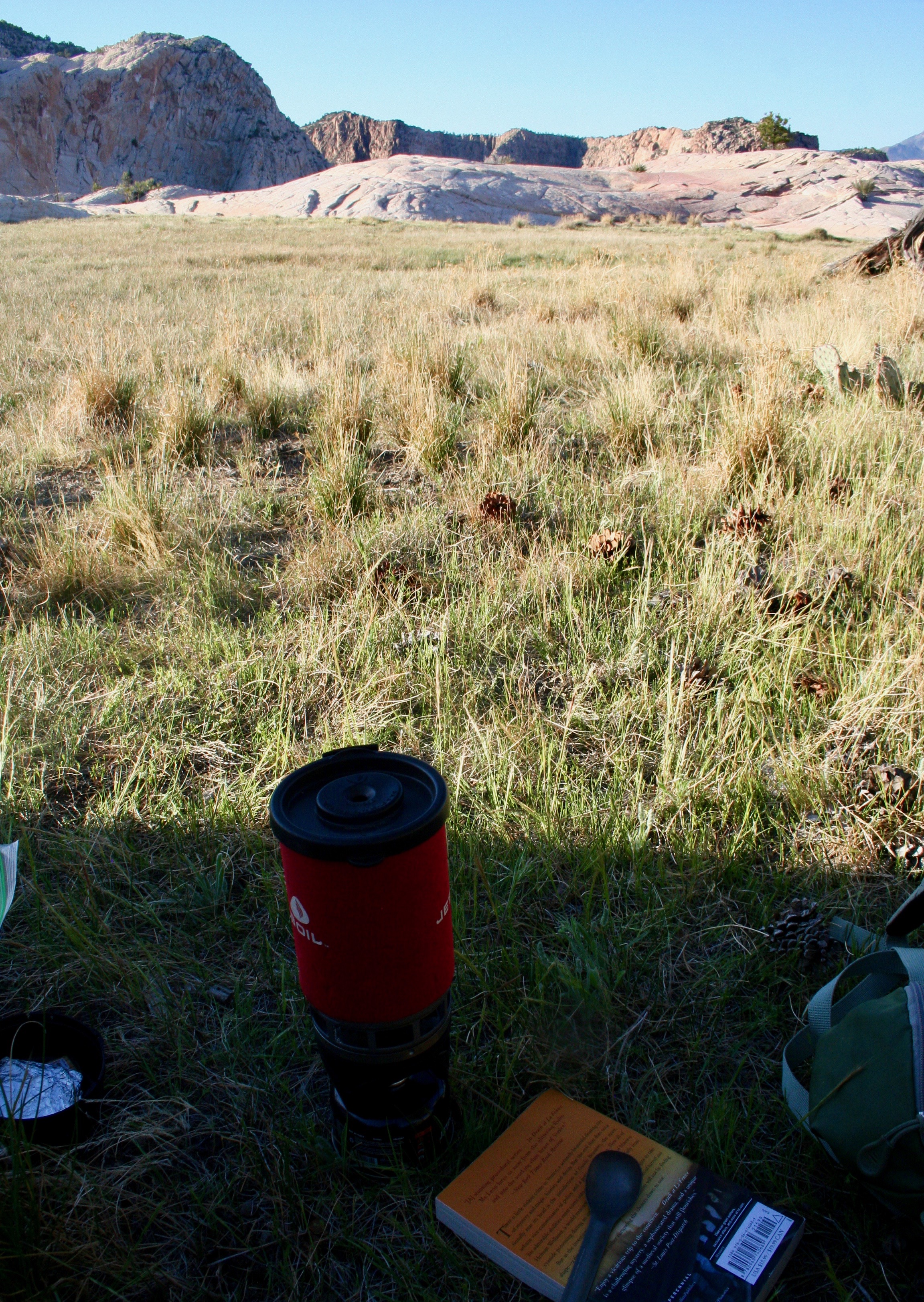 Broad sunlight turning the tent into a sauna served as my next alarm. I arose misted with sweat and was cooled off by a light breeze. I boiled water over and over for coffee and read my book as the sun climbed up the ladder of the sky. Soon, it put the cool breeze on the shelf and replaced it with a warm one.