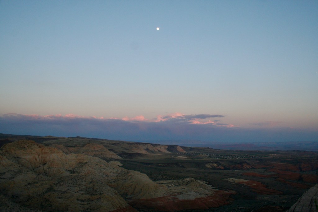 When I found the most spectacular view, I sat down and drank it all in like a parched camel, forgetting about my journal, my worries and the passing of time. I lapped up the rosy reds and the smoky blues that, especially at sunset, began to resemble the depths of an ocean. Faraway houses could have been bulbous creatures waiting on the ocean floor for bits of this or that to drift down. I imagined the desert ridges and peaks with their mysterious crevices to be primordial fumaroles about to spew magma. And then the moon came up and stole me from my dream with its cool luminescence.