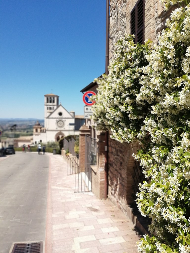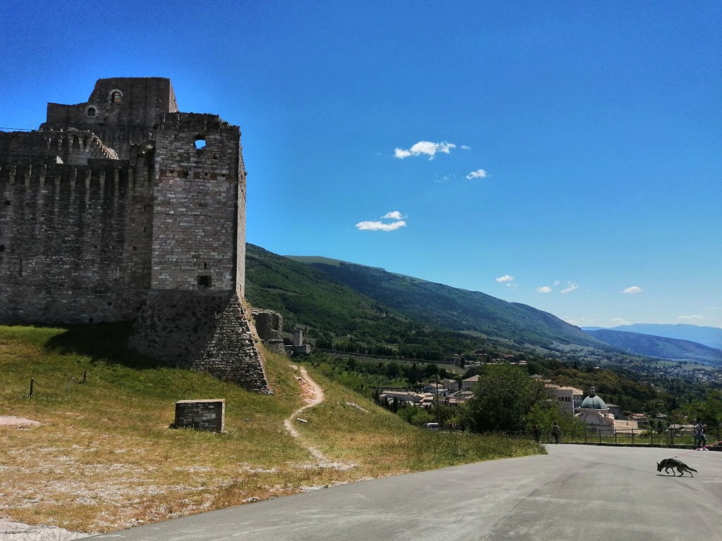 The sun was high in the sky when we reached Assisi, the birthplace of St. Francis. After a short descent to the Basilica the only way was, of course, up through cobbled streets just beginning to be crowded with tourists again. We climbed up to a church housing a Roman cistern and then to the oldest part of town with its narrower streets and gray stone houses. Finally, to the cheers of a gang of motorcyclists, we arrived at the fortress looming above.