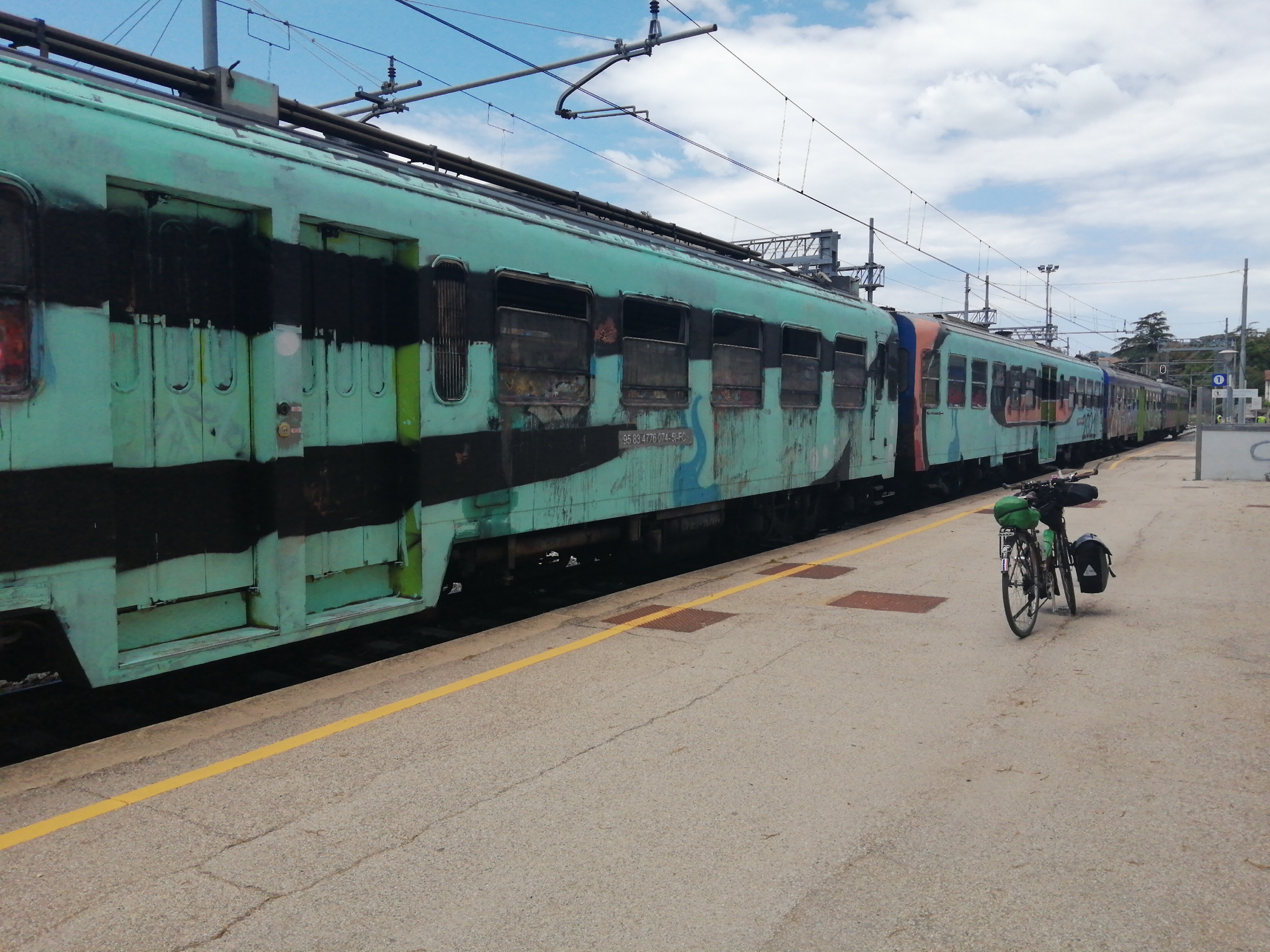 Again, the tinny voice insisted, “Train 9702 to Perugia is ready to depart from track one.” This message would continue even after we were again waved into the unmoving train and had eaten most of our sandwiches. When it did depart, we had to babysit our wobbling bikes, which were taking up the entryway because Umbria doesn’t believe in designated bike zones. We had long ago given up hope on making our next connection, which may or may not have existed anyway.