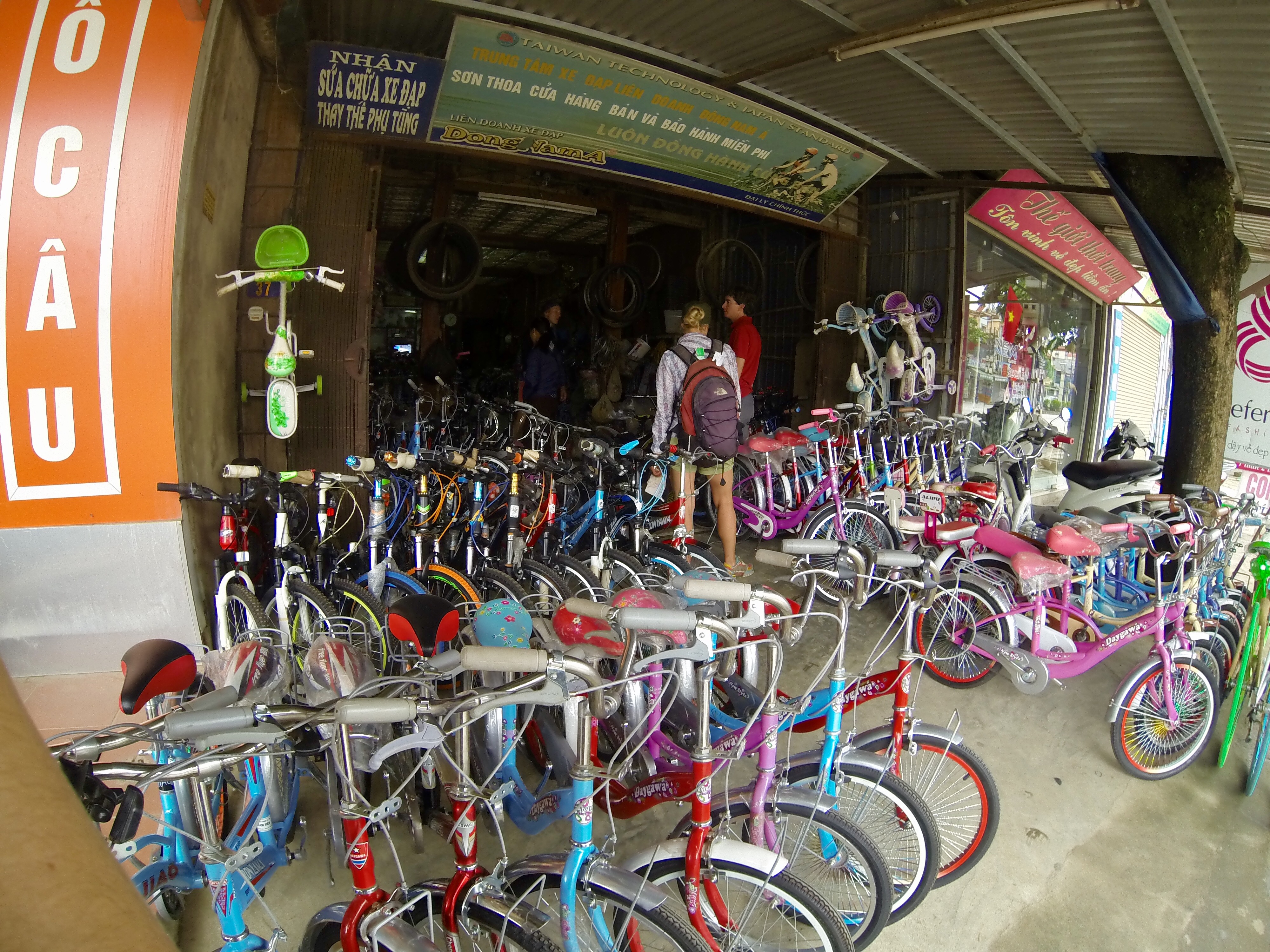 Shopping for brake pads and spare cables on bike and scooter shop row.